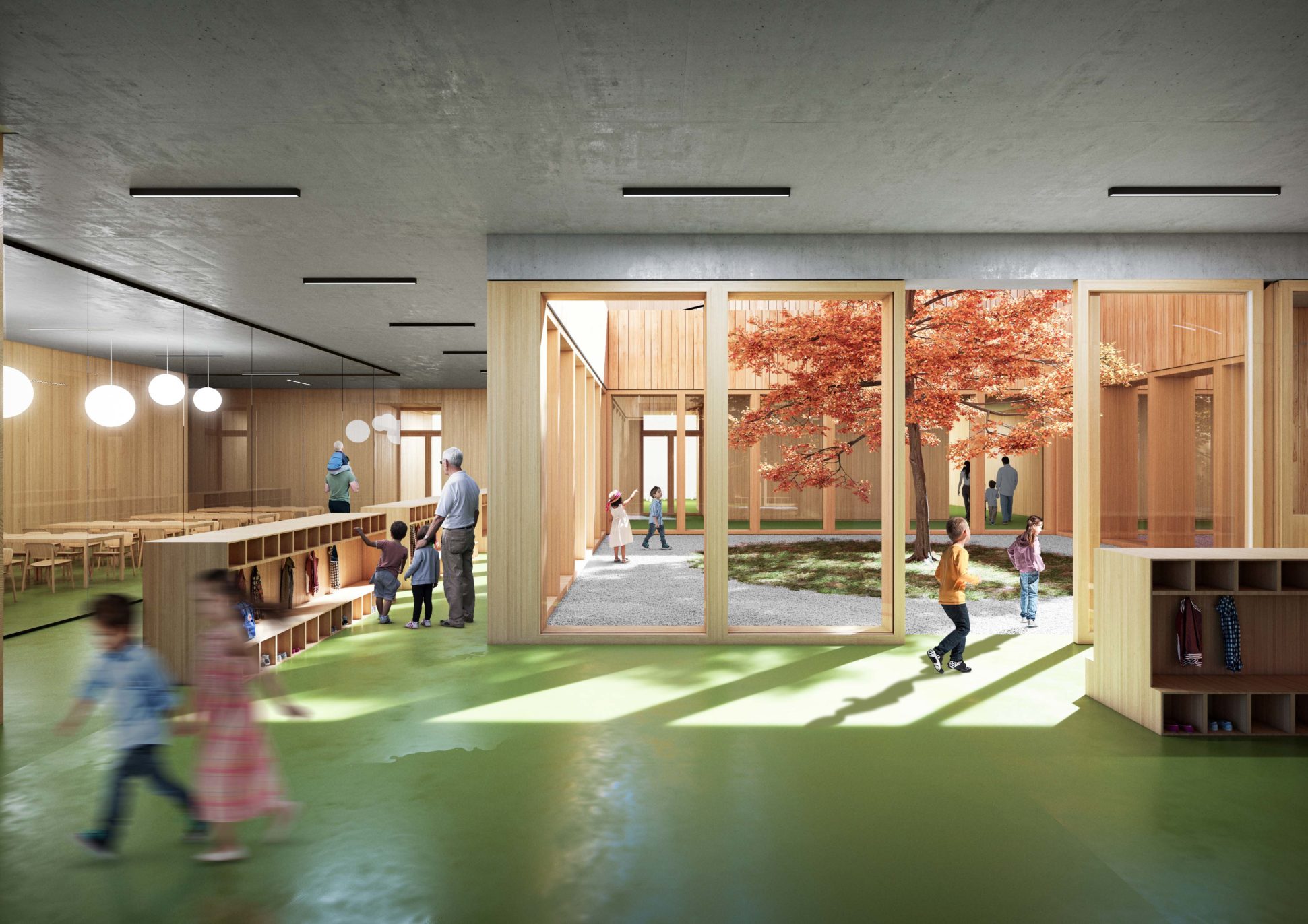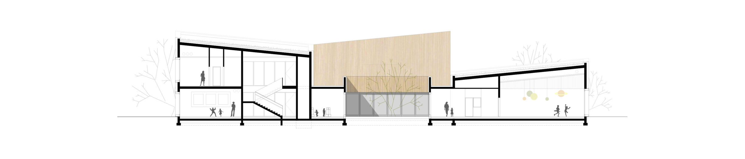 i funkcjonowanie przedszkola. Dzieli ono również budynek na część publiczną strefy wejściowej oraz przestrzeń kameralną sal dydaktycznych. Wyznacza dodatkowo oś widokową pomiędzy wejściem głównym a ogrodem zewnętrznym.