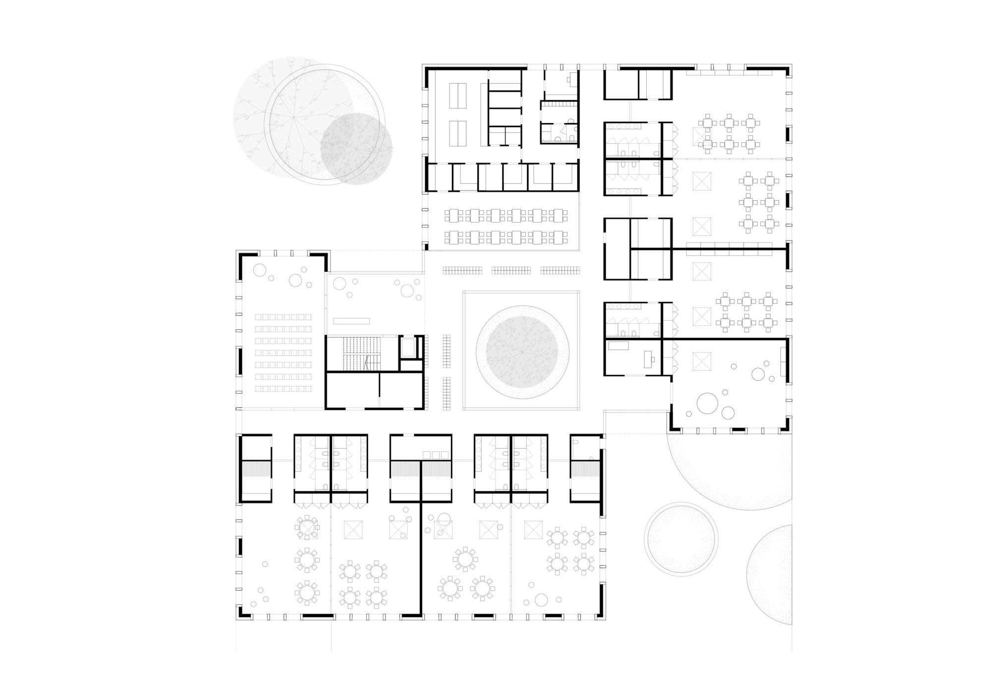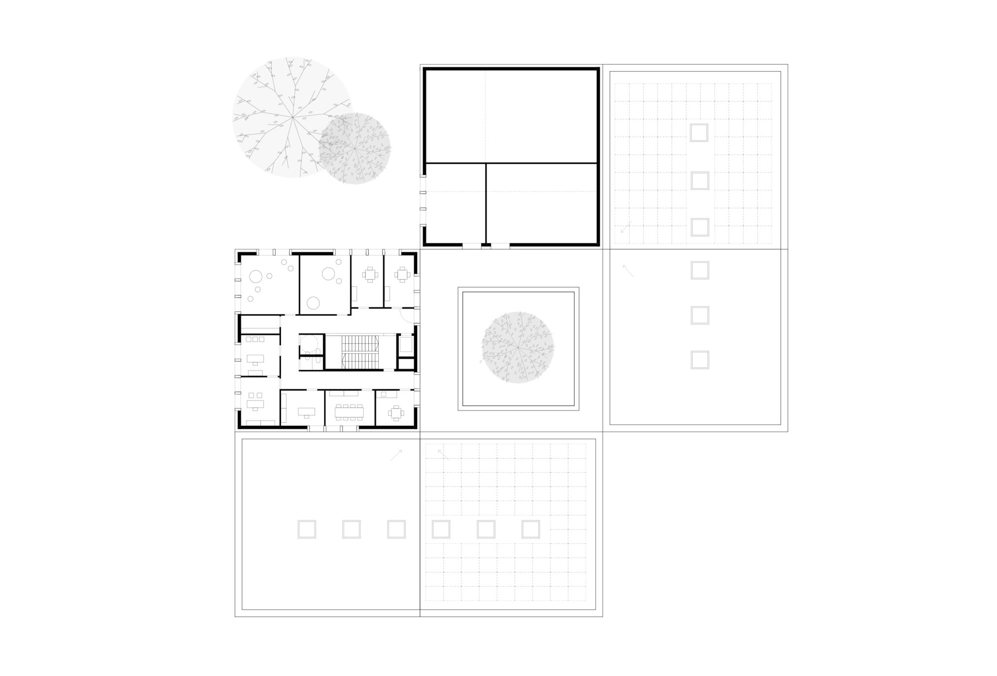 W miejscu przecięcia modułów przewidziano centralne patio, które stanowi serce budynku, równocześnie doświetlając wnętrze. Jest ono głównym elementem organizującym przestrzeń