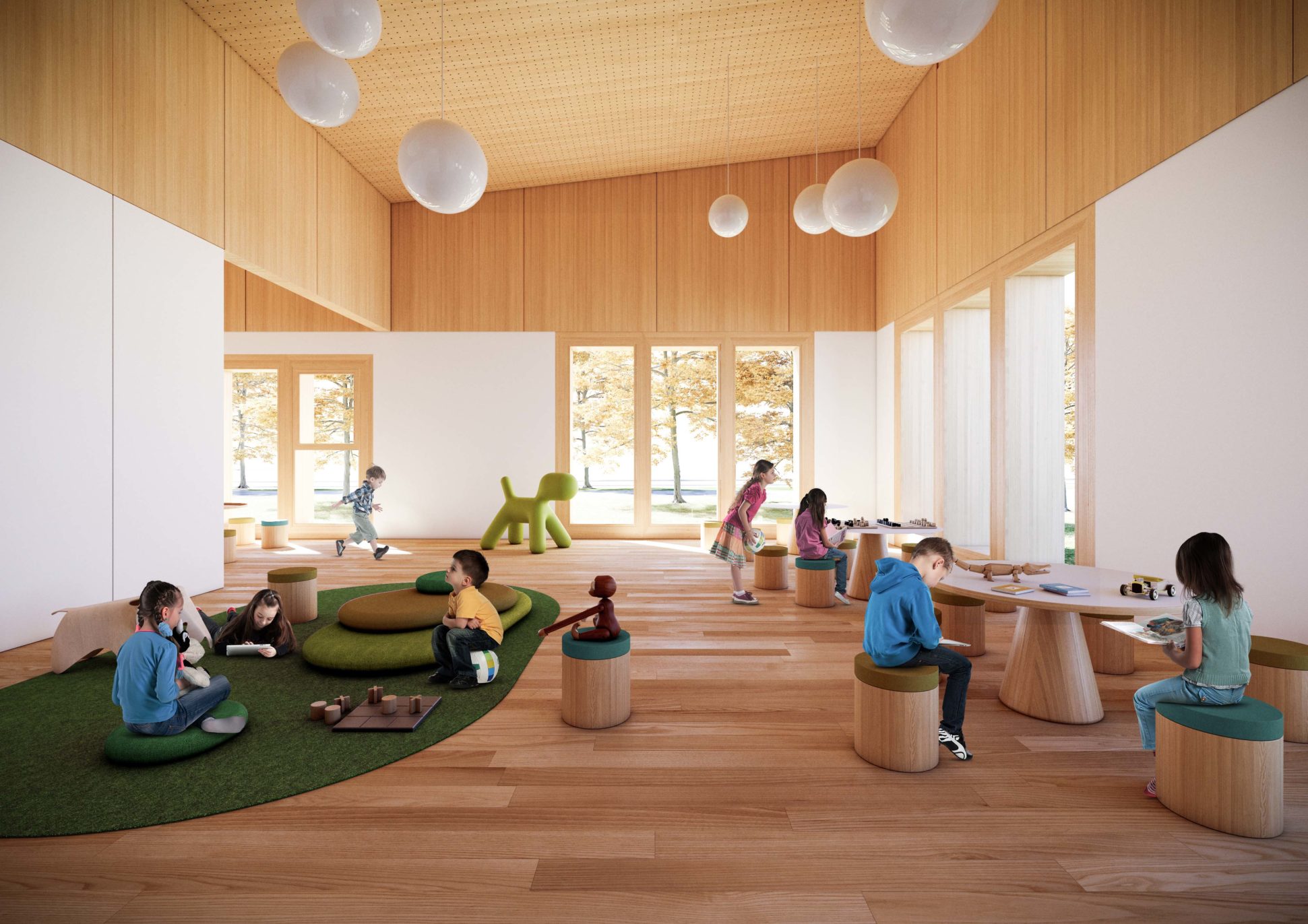 Obiekt przedszkola został zaprojektowany na dwóch przenikających się modułach, które dzielą się na mniejsze o różnym nachyleniu połaci dachu oraz wysokości. Poprzez ten zabieg budynek skalą dostosowuje się do swojej funkcji oraz sąsiadujących domów jednorodzinnych (część jednokondygnacyjna) i przyszłych zabudowań kampusu (część dwukondygnacyjna).