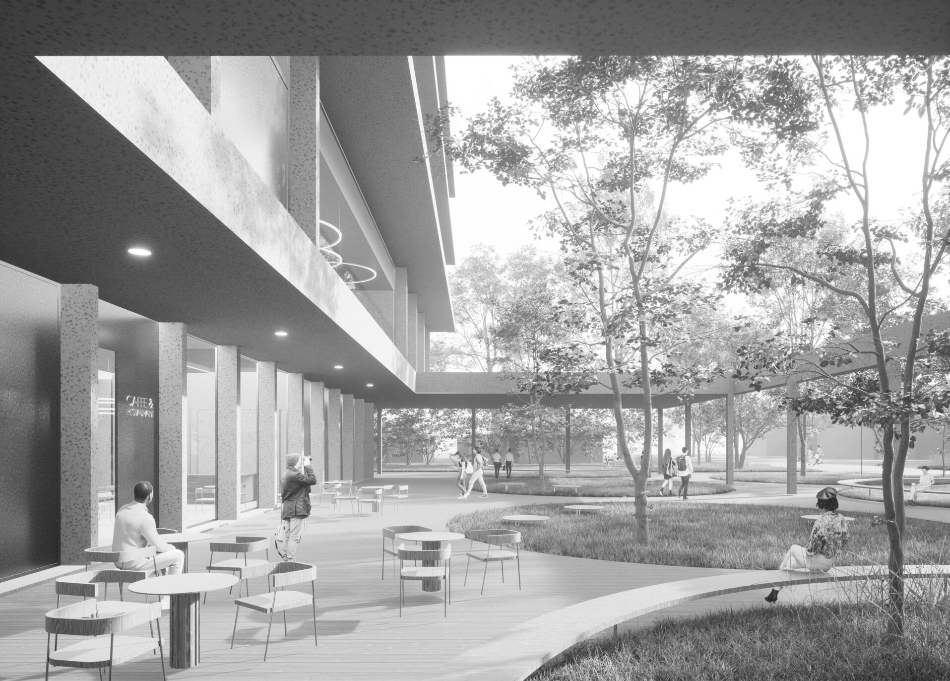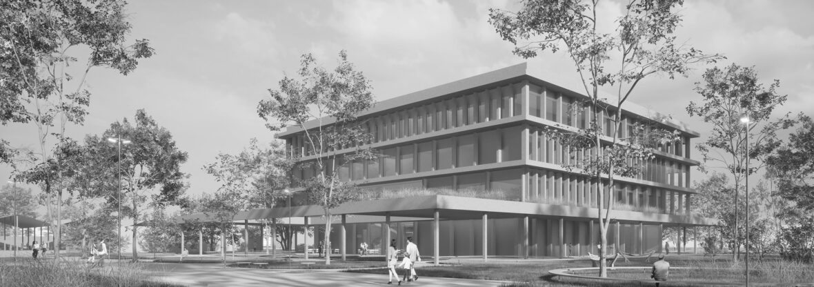 Projektowany budynek nawiązuje bezpośrednio do linii istniejącej zabudowy, opartej na ortogonalnym układzie przestrzennym, co pozwala mu idealnie wkomponować się w tą przestrzeń, nadając jej nowoczesnego charakteru.