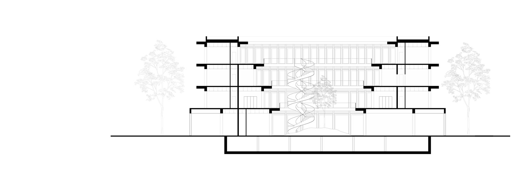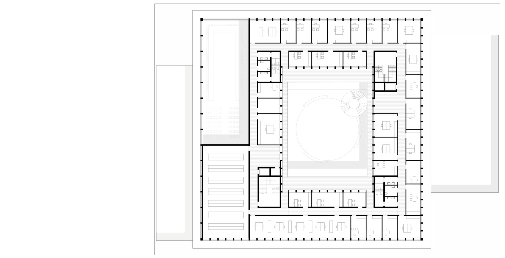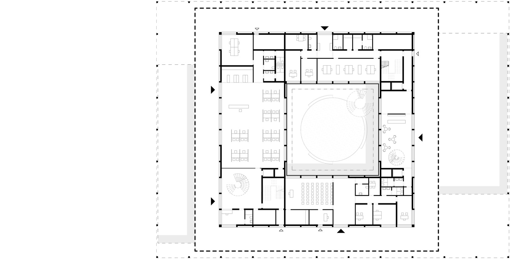 Bryła budynku została zaprojektowana na planie kwadratu, co pozwoliło na uzyskanie zwartej formy, przełamanej kameralnym dziedzińcem, stanowiącym przestrzeń odpoczynku i kontemplacji.