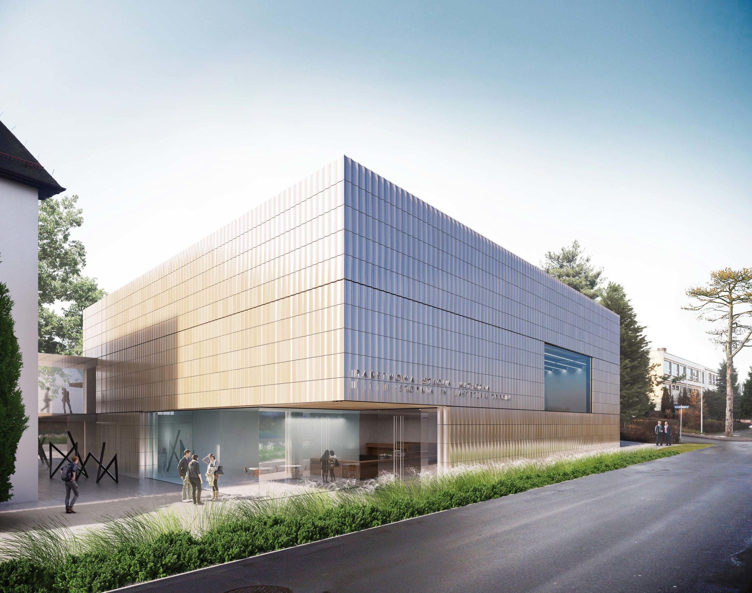 Proponowana koncepcja przestrzenna bezpośrednio wchodzi w relację z otoczeniem stanowiąc jego dopełnienie z poszanowaniem istniejących uwarunkowań lokalizacyjnych. Nowo projektowany budynek stanowi bryłę harmonijnie wkomponowaną w zastaną sytuację. Głównymi założeniami były przede wszystkim jak najmniejsza ingerencja w istniejący obiekt Szkoły Muzycznej oraz teren wokół niej, zachowanie skali otoczenia, utrzymanie spójności formy architektonicznej oraz jak najlepsze skomunikowanie części istniejącej z częścią projektowaną. Nadrzędnym celem projektowym było stworzenie jednorodnego w odbiorze obiektu, który poprzez celowe ograniczenie środków wyrazu stałby się tłem dla rozgrywających się w nim wydarzeń. Obiekt charakteryzuje się powściągliwą formą oraz niestandardowym materiałem elewacyjnym. Zabieg ten pozwala na ukształtowanie budynku rozpoznawalnego, intrygującego, choć nie ingerującego nadmiernie w zastaną tkankę miasta.