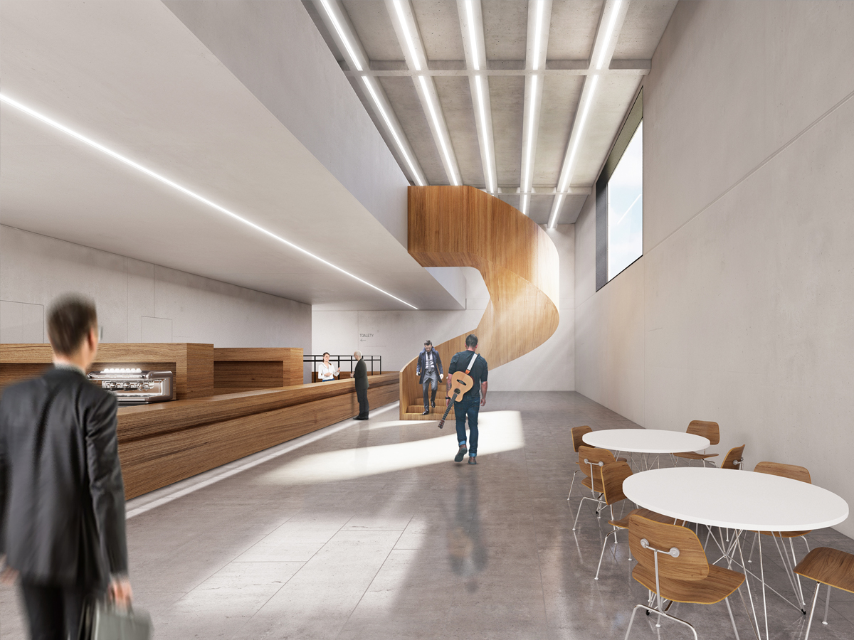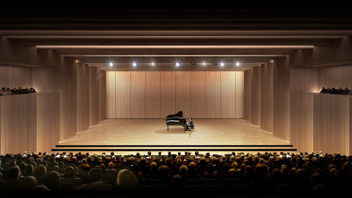 Proponowana koncepcja przestrzenna bezpośrednio wchodzi w relację z otoczeniem stanowiąc jego dopełnienie z poszanowaniem istniejących uwarunkowań lokalizacyjnych. Nowo projektowany budynek stanowi bryłę harmonijnie wkomponowaną w zastaną sytuację. Głównymi założeniami były przede wszystkim jak najmniejsza ingerencja w istniejący obiekt Szkoły Muzycznej oraz teren wokół niej, zachowanie skali otoczenia, utrzymanie spójności formy architektonicznej oraz jak najlepsze skomunikowanie części istniejącej z częścią projektowaną. Nadrzędnym celem projektowym było stworzenie jednorodnego w odbiorze obiektu, który poprzez celowe ograniczenie środków wyrazu stałby się tłem dla rozgrywających się w nim wydarzeń. Obiekt charakteryzuje się powściągliwą formą oraz niestandardowym materiałem elewacyjnym. Zabieg ten pozwala na ukształtowanie budynku rozpoznawalnego, intrygującego, choć nie ingerującego nadmiernie w zastaną tkankę miasta.