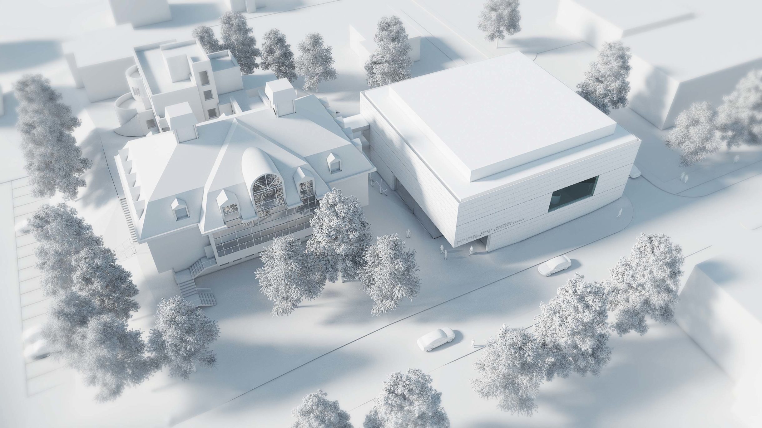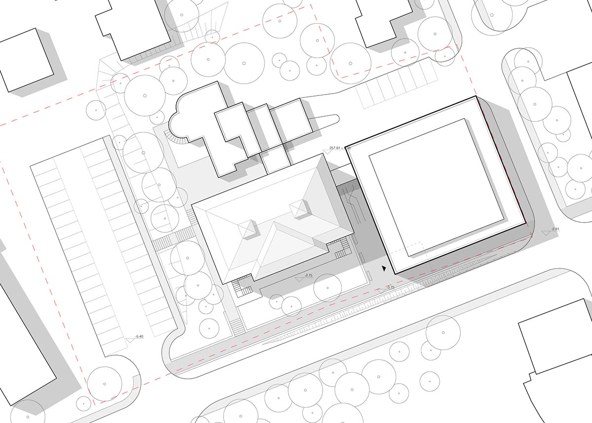Koncepcja urbanistyczna charakteryzuje się klarownym założeniem spełniającym jednocześnie wszelkie zapisy regulaminu konkursowego.Obiekt usytuowany został w północno – wschodniej części działki. Wejście główne zaprojektowano na poziomie -1 i umieszczono w południowo – wschodnim narożniku obiektu, przyjmując porządek stanu istniejącego. Jego lokalizacja wybrana została zgodnie z analizą istniejących ciągów komunikacyjnych oraz charakterystyki ruchu pieszego w najbliższym otoczeniu.